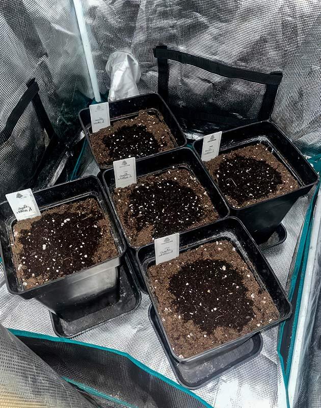 Проращивание прошло на ура. Как это всегда бывает с классными семенами от надежного производителя, из пяти орешков взошли все пять. Использовал классический метод с бумажными полотенцами и пластиковым контейнером для удержания влажности. Через 48 часов все семечки дружно приоткрыли скорлупки и выпустили корешки. Не тратя времени зря, я пересадил их в 7-литровые горшки с подготовленным грунтом и немножечко пролил водой с добавлением 0,1 мл/л корневого стимулятора Flash Root. Это и все остальные удобрения, которые буду использовать в данном цикле, от бренда Agrobeta.